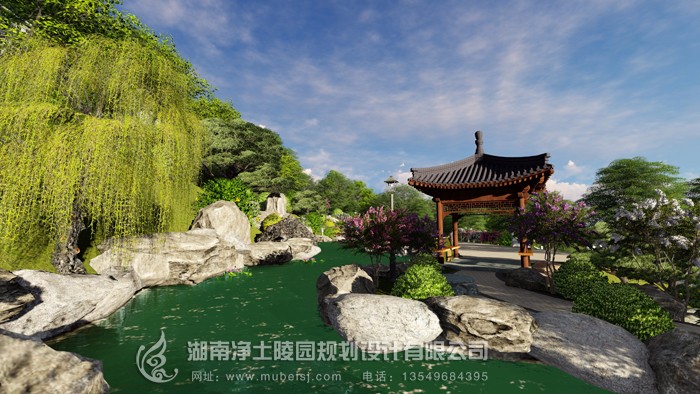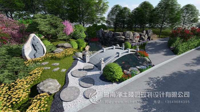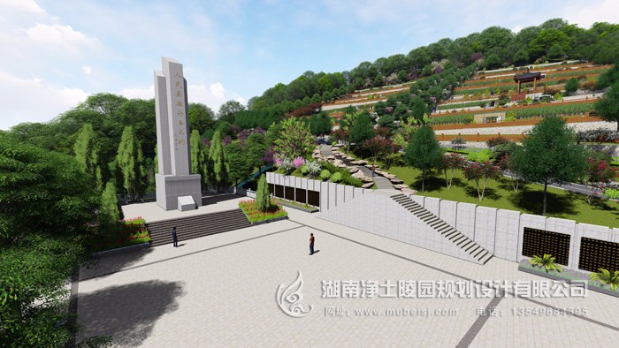 陵園規劃占地1090畝。按我國傳統皇陵中軸線方案規劃布局。氣勢宏大,又輔以“金水玉帶”的典型風水格局,莊重而典雅。陵園對岸的“玉帶村”、“福祿村”(原地名)和陵園遙之呼應。山勢如“狀元筆架”形成了“集天地之浩氣于園內,聚萬物之靈性于陵中”的神奇效應。難怪國內著名的風水專家,北京的一凡大師看過此地后,不勝感嘆,驚為天人。實為逝者安息之上上風水寶地也!