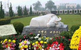 墓的主體是安祥沉靜的寫意牛。虛實之間,既凝練了牛老伯執著、堅強、忠誠和腳踏實地的人生寫照,又延續了值得后人繼承和發揚的“牛”的精神。設計中,“牛”的神態是安祥的,奉獻一生的牛老伯,現在應該是休息的時候了,這樣的神態也更能表現出他老人家善良、坦蕩、睿智和平易近人的品格。墓的下半部分是一塊整石的自然雕刻,穩重而大氣磅礴,給人一種堅實的整體厚重感,同時也映襯和托舉了“牛”的精神,讓這種人文文化得到久遠的傳承。
